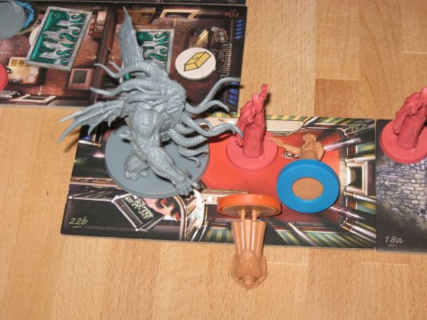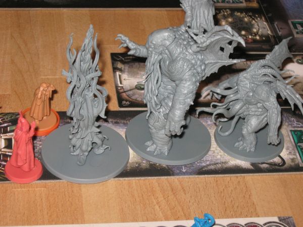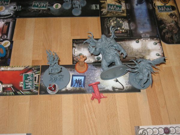 Die Spielplanteile unterstützen natürlich vor allem die neuen Szenarien und zeigen unter anderem ein Casino, einen Kirchenraum, den Tresorraum einer Bank und ein Lagerfeuer in der Wildnis, über dem gerade irgendein bizarres Wesen am Spieß gebraten wird. Lecker. Die detaillierten Monsterminiaturen sehen erfreulich schaurig aus und rekrutieren sich aus dem bekannten Katalog der Mythoswesen, vom Tcho-Tcho über den Sternenvampir bis zu einem pflanzenartig exotischen Älteren Wesen. Ein neuer Großer Alter, jeweils der Hauptgegner der „C:DMD“-Episoden, ist nicht in der Box enthalten. Wer hier über das Grundset hinaus Abwechslung sucht, muss zu den Einzel-Erweiterungen „Yog-Sothoth“ und „Schwarze Ziege der Wälder“ greifen, die separat zu kaufen sind.