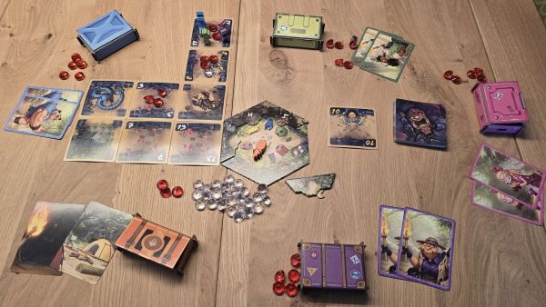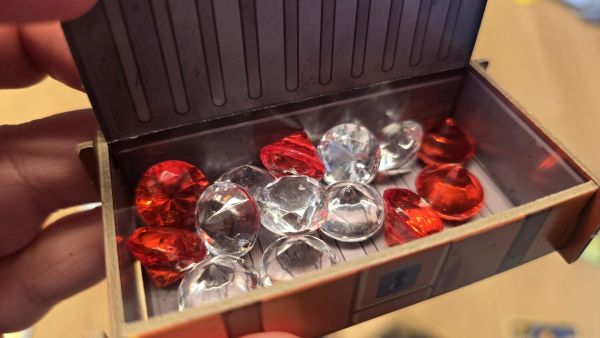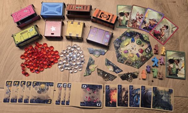 In der kompakten Spieleschachtel sind weitere acht bunte Schachteln zu finden, wenn man sie dann mal zusammengebaut hat. Das funktioniert ohne Probleme schnell und gut. Und dann erkennt man: Die Schachteln sind wirklich liebevoll gestaltete Schatzkisten. Dann funkeln einen auch schon ein Haufen Rubine und Diamanten an. Das ist toll gemachtes Zeug – genauso wie die Holzfiguren, die alle unterschiedlich gestaltet sind. Ein Kartendeck, ein paar Plättchen und ein Mini-Spielplan runden das Material ab. Die Qualität der Komponenten ist grundsolide und überrascht bei dem am Markt aufgerufenen Preis. Die UVP liegt bei knapp 20 Euro. Die Illustrationen sind comicartig, modern und ansprechend. Hier fühlt sich nichts altbacken oder staubig an. Die Anleitung ist zeitgemäß. Das Spiel lässt sich mit Hilfe der Anleitung schnell erschließen – es ist aber auch wirklich einfach.
