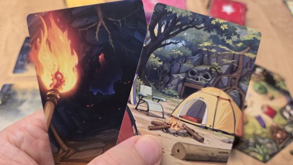 Die Spieler decken also wiederholt Karten auf und legen sie an den bisher erkundeten Höhlengang an. Wird eine Schatzkarte aufgedeckt, erhalten alle beteiligten Abenteurer den gleichen Edelsteinanteil. Übrige Edelsteine werden erstmal im Höhlengang abgelegt. Nach Verteilung der Beute wird nun jeder Spieler gefragt, ob er tiefer in die Höhle hineinsteigen oder raus auf den Campingplatz in den sicheren und kuscheligen Schlafsack gehen will. Dazu legen alle Spieler gleichzeitig und verdeckt eine von zwei Karten verdeckt aus, die ihr weiteres Vorgehen auf dieser Schatzjagd anzeigen.