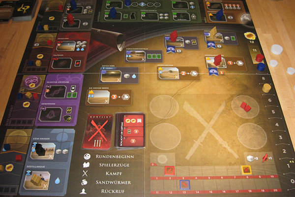 In Phase 3 folgt der Kampf. In jeder Spielrunde wird um ein Gebiet gekämpft. Um hier zu triumphieren (was ebenfalls Siegpunkte einbringt und einem die Kontrolle über das Gebiet verleiht), muss man genug Soldaten auf Arrakis haben, denn diese erhöhen die Kampfstärke in einem Konflikt, ebenso wie passende Intrigenkarten oder Karten, die im eigenen Aufdeckzug ausgelegt wurden. Dann wird schlichtweg ausgezählt. Der Spieler mit der höchsten Kampfstärke gewinnt. Je nach Spieleranzahl werden auch Zweit- und Drittplatzierte belohnt. Nur ein Spieler geht jeweils völlig leer aus. In Phase 4 „Sandwürmer“ entsteht neues Spice auf bestimmten Feldern. Und in Phase 5 „Rückruf“ werden die Agenten zurückgeholt und der Startspieler-Marker weitergegeben – sofern niemand bereits 10 Siegpunkte errungen hat.