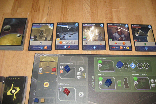 An Feldern gibt es einerseits Kampfschauplätze auf Arrakis, andererseits vier Fraktionen (Haus Corrino, dem der Imperator angehört, die Raumgilde, den Bene-Gesserit-Orden und die Fremen) sowie den Landsraad und die MAFEA (die größte Handelsorganisation). Je nachdem wo man seinen Agenten platziert, erhält man Ressourcen (Wasser, Spice, Solari), kann Soldaten rekrutieren, darf Intrigenkarten (spezielle Effektkarten) ziehen, zusätzliche Imperium-Karten vom eigene Stapel auf die Hand nehmen usw. Die Fraktionsfelder lohnen sich dabei doppelt, denn man gewinnt bei Besuchen einer Fraktion dort Einfluss, was nach zwei beziehungsweise vier Punkten mit einem Siegpunkt belohnt wird. Die Arrakis-Felder verstärken dagegen zusätzlich die eigenen Militärpräsenz auf dem Wüstenplaneten, was dann wichtig in Phase drei, dem Kampf wird. Wichtig noch: Natürlich braucht man nicht nur das passende Symbol eines Felds, um dort einen Agenten platzieren zu dürfen, man muss auch die Feldkosten bezahlen, je nach Ort Wasser, Spice oder Solari. Mangelverwaltung gehört also auch zum Spiel dazu.