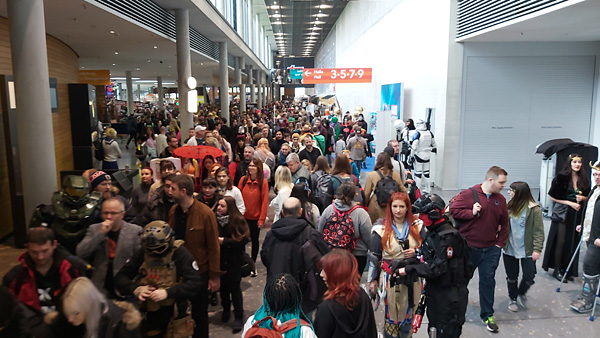 Es ist jetzt vielleicht 9:20 Uhr, die Messe hat gerade mal seit 20 Minuten offen. Trotzdem drängt es sich in den Eingangsbereichen bereits so dicht und bunt wie in der Stuttgarter Fußgängerzone zum Sommerschlussverkauf. Satte 48.000 Besucher sollen es im Laufe des Wochenendes werden (laut Abschluss-Pressemeldung der Veranstalter). Erste Händler stehen im Gang, und Buden preisen ihre themenbezogenen Gerichte an. Ein Typ, der aussieht, wie der Master Sergeant aus dem Videospiel „HALO“ verteilt Energy Drinks. Ein hochgewachsener Wookiee passiert mich, gefolgt von zwei Space Marines, die ihn tatsächlich noch wie einen Zwerg aussehen lassen. Ich bedaure schon jetzt, nur mein Handy und nicht meinen Fotoapparat mitgenommen zu haben.