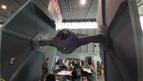 Endlich erreiche ich die für mich zentrale Attraktion: die „Galactic Cantina“, ein weiteres Novum, ein von Robert Eiba (der Chefredakteur des „Offiziellen Star Wars Magazins“) organisierter Bereich, der ganz „Star Wars“ gewidmet ist. Im Schatten eines gewaltigen Modell-TIE-Jägers sammeln sich hier Fangruppen und Händler, um alle Aspekte der Saga zu feiern. Imperiale, Rebellen und Mandalorianer stehen hier Seite an Seite, in Vitrinen glänzen Lichtschwerter, auf Präsentationsständern glühen Modellraumschiffe. Fotopoints laden zum Posieren mit Darth Vader oder Obi-Wan Kenobi ein, und wer ein leichtes Hungergefühl verspürt, findet an der Blue Harvest Bar und im Twin Suns Diner direkt unterhalb der Force Stage Linderung.
