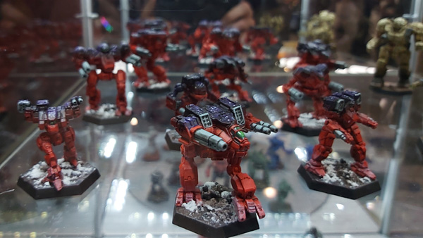 In Halle 8 steht dann das Präsentieren und Verkaufen ganz im Vordergrund. Hier reiht sich Stand an Stand, Händler und Künstler Seite an Seite. Panini ist eingangsnah mit einem großen Comic-Stand vertreten, an der Wand gegenüber hat Hugendubel eine Messebuchhandlung mit Phantastik satt aufgebaut. Im hinteren Teil der Halle geht es, unter der Schirmherrschaft von Topps, ganz um Sammelkarten (also nicht die zum Spielen, sondern nur die zum Anschauen). Als Ringbote freue ich mich besonders über die leider etwas unterbesuchte Präsenz der MechForce Germany, dem größten deutschen Tabletop-Verein mit dem Schwerpunkt „BattleTech“. Hier kann man nicht nur zahlreiche bemalte Mechs in Vitrinen bestaunen, sondern sich auch an mehreren Tischen klassisches Hex-Feld-„BattleTech“ oder die TableTop-Variante „Alpha Strike“ erklären lassen. Eine Partie „Alpha Strike“ hätte ich mir sehr gern gegönnt, leider reicht dafür meine Zeit nicht mehr.