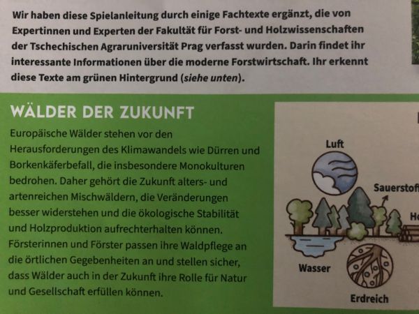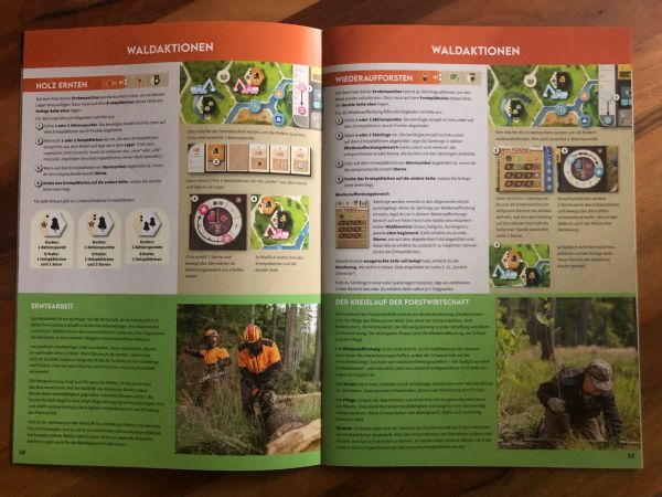Zwischen den Regeln befinden sich grün hinterlegte Infoboxen, die die (ökologischen/ökonomischen) Hintergründe zu den Aktionen beziehungsweise zum Spiel erklären: die Rolle von Erntemaschinen, welche Holzarten häufig geforstet werden oder welche Aufgaben mit der „Forstwirtschaft“ verbunden sind – der Begriff „Forstwirtschaft“ in Anführungszeichen, denn die eine Forstwirtschaft gibt es nicht, sondern diese ist sehr vielfältig. Ich für mich empfinde es als sehr stimmig und sinnvoll, wenn die Infos bereits bei den Aktionen stehen. Das hat mir auch bei anderen Spielen bereits sehr zugesagt. Auf der letzten Seite der Anleitung befindet sich noch eine Symbol-Übersicht, die ich sehr hilfreich fand. Ebenso die beigelegten zwei Übersichtsplättchen mit Aktionsmöglichkeiten, Aufbau- und Endwertung.