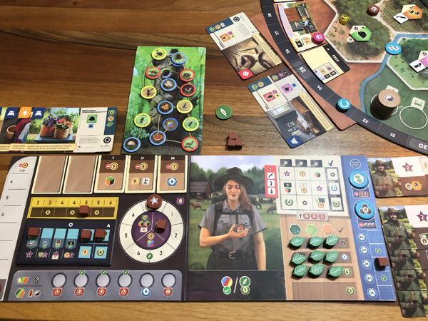 Das Herzstück des Spiels ist ein großformatiger, runder Spielplan, der in drei farblich getrennte Bereiche unterteilt ist: braun, hellgrün und dunkelgrün – jeweils mit einem eigenen Wald- und Sägewerkssektor. Du erhältst einen individuellen Charakterplan, auf dem du deine persönlichen Fortschritte, Ressourcen und Entwicklungen festhältst. Dort notierst du, wie viele Aktionen dir pro Runde zur Verfügung stehen, wie weit du deine Technologien entwickelt hast, wie gut du aufforstest oder schützt und welche Materialien du in deinem Lager bereithältst.