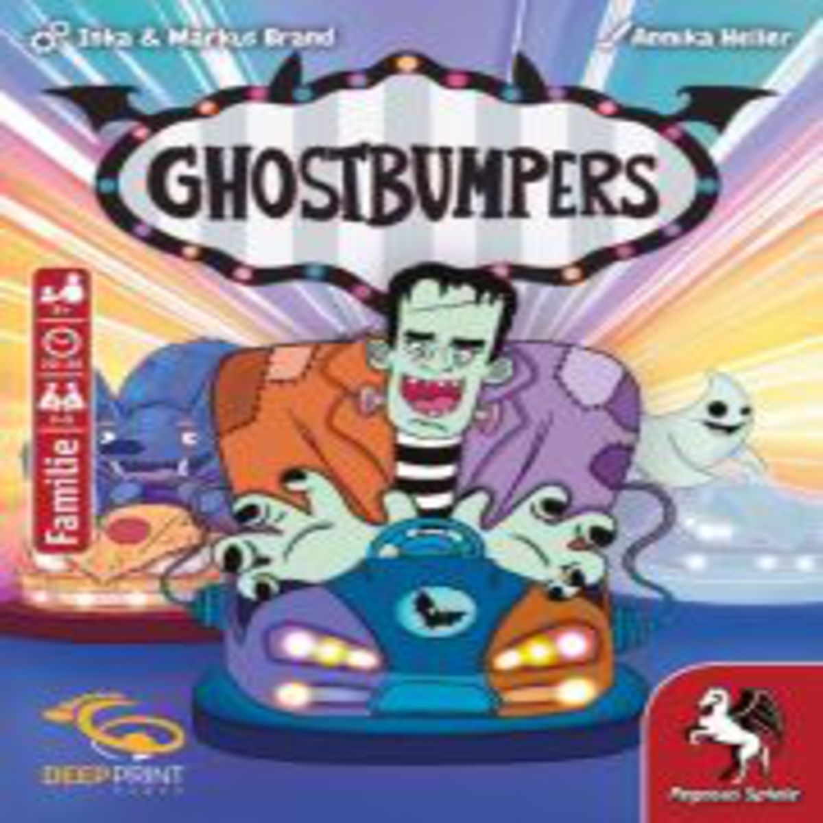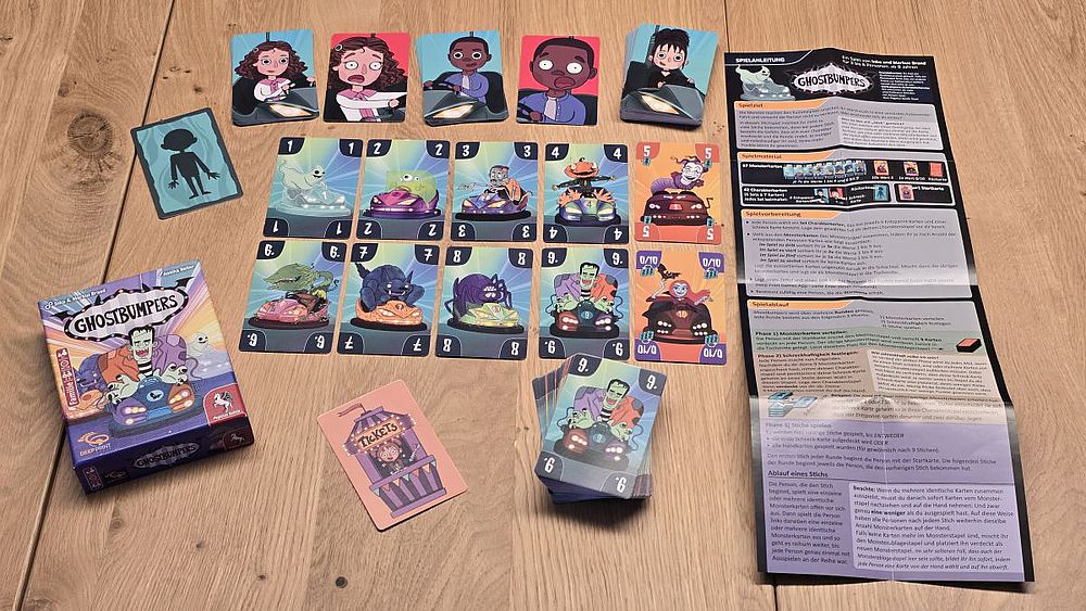 Fazit: „Ghostbumpers“ ist erstaunlich vielschichtig. Die Gefahr: Viele Spielerunden erschließen sich das gar nicht. Und dann droht es, beliebig zu wirken und nicht mehr angefasst zu werden. Einmal durchdrungen ist „Ghostbumpers“ von „Ich denke, dass Du denkst“-Momenten, Bluffs und Tempowechseln geprägt. Durch die Möglichkeit, Karten einzeln oder als Paket auszuspielen, hat man mit fast jedem Blatt mehrere taktische Möglichkeiten. Damit fühlt man sich nicht so ausgeliefert, wie es bei klassischen Stichspielen in der Regel der Fall ist. Kinder ab 8 Jahren können das Spiel schon mitspielen, werden aber die Möglichkeiten, die das Spiel bietet, in der Regel nicht erfassen können. Für Gruppen, die eher mal kurz was spielen wollen, würde ich „Ghostbumpers“ nicht bedingungslos empfehlen. Für mich ist „Ghostbumpers“ jedoch ein sehr gutes Kenner-Stichspiel mit Tiefe und auf der Verpackung mit „Familie“ eigentlich nicht passend gelabelt. Und der freundliche Frankenstein im Autoscooter hilft da auch nicht.