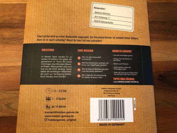 Fazit: Wir haben schon einige Exit-, Adventure- und Detektive-Games gespielt. Das war unser erstes Spiel der „Hidden Games“-Reihe. Uns hat es sehr gut gefallen, da man hier nicht an einzelnen, kleinen (manchmal sehr abstrakten, kryptischen) Rätseln verzweifelt, sondern hier in einem Gesamtkontext versucht, die Lösung zu finden. Auch die Zuschaltung von WhatsApp-Nachrichten und Internetrecherche fanden wir sehr erfrischend und gelungen. Die Geschichte war für uns logisch aufgebaut und der Spielspaß kam nicht zu kurz. Mit Zuhilfenahme zweier Tipps, waren wir als Ermittlerteam nach 150 Minuten erfolgreich und Frau Böhnke mit unserer Arbeit zufrieden. Das war sicher nicht der letzte Fall für uns. Klare Empfehlung für Spielende, die sich an einen realitätsnahen Kriminalfall wagen und keine klassischen „Exit“-Rätsel lösen wollen.
