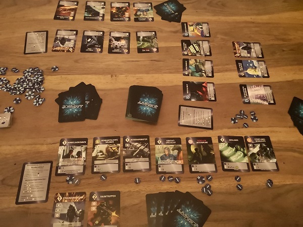 Das Spiel besteht aus einer kleinen Box, die durchaus auch noch kleiner hätte sein können, ein paar Markern und natürlich sehr vielen Karten. Die Qualität ist gut, die Optik geht in Ordnung und wer eines der anderen beiden Spiele kennt, wird sofort einige Dinge wiedererkennen. Die Anleitung ist sehr kurz und relativ gut verständlich. Allerdings gab es bei uns ein oder zwei Unklarheiten, die etwas konkreter hätten beschrieben werden können. Diese waren aber nicht schwerwiegend, und man konnte recht schnell eine Festlegung treffen.