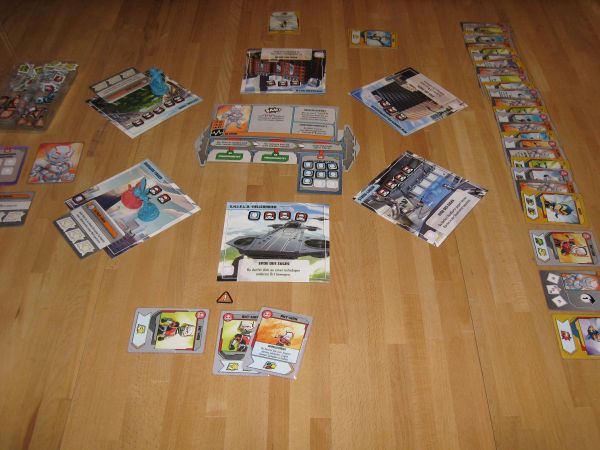 Zu Beginn einer Partie wird das zentrale Schurkentableau ausgelegt, inklusive der 3 Missionskarten (Verbrecher besiegen, Zivilisten retten, Bedrohungen beseitigen – mehr gibt es im Grundspiel auch nicht, aber das mag sich mit den Erweiterungen ändern). Drumherum werden zufällig sechs Orte verteilt, etwa die Avengers-Villa, das Stark-Labor oder der Central Park in New York, der Stadt, die Schauplatz des Spiels ist. An jedem Ort wird dann eine Bedrohungskarte angelegt, die negative Effekte hat und bezwungen werden kann, um den positiven Effekt des Orts darunter „freizuschalten“. Außerdem werden auf die Orte eine feste Zahl Zivilisten und Verbrecher gelegt, die man – siehe gerade eben – retten respektive bekämpfen kann. Die Marker kommen dann später auf die entsprechenden Missionskarten, und sind diese erfüllt, ändern sich die Spielbedingungen. So kann ein Endgegner erst angegriffen werden, wenn zwei beliebige Missionen geschafft wurden. Bereits nach einer geschafften Mission wird die Spannungsschraube angezogen, indem der Endgegner nun häufiger zuschlägt.