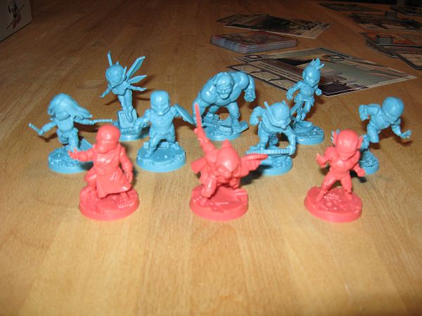 Das funktioniert so alles gut, bis man anfängt, Karten zu sleeven und Marker (mindestens) in Ziplock-Beutel zu sortieren. In dem Moment wird es sehr eng, und da das Inlay für die Miniaturen auch fest mit dem Teil für die Karten und Marker verbunden ist, kann man nicht mal Platz schaffen, indem man jenen zweiten Teil aus der Box nimmt und den Leerraum darunter nutzt. Für Spieler, die gern Ordnung in der Box haben, ist das etwas unerfreulich. Drei Alternativen hat man: 1) die Marker lose ins kleinste Fach packen (und Reste irgendwo in der Box verteilen), 2) die Marker in einem extra Sortierkästchen außerhalb der Spielbox aufbewahren (um alle drei Fächer für die gesleevten Karten nutzen zu können) oder 3) eine Sortierlösung wie etwa das Schaumstoff-Set von Feldherr extra erwerben.