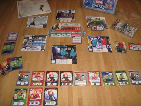 Die enthaltene Auswahl an Spielmaterial ist für mehrere Partien vollkommen ausreichend. 1 bis 4 Spieler übernehmen jeweils einen Helden (im Solo-Spiel nimmt man 3), das heißt die Auswahl ist bei 7 Helden zwar nicht episch, aber erlaubt doch einige Kombinationsmöglichkeiten. Auch die 3 Schurken sorgen für Abwechslung. Von den 8 Orten werden pro Partie stets 6 gebraucht. Hier hätten es gern noch 2 bis 4 mehr sein dürfen. Aber zumindest 4 Erweiterungen (zu den Filmen Black Panther, Thor, Guardians of the Galaxy und Spider-Man) sind ja geplant, also lässt sich das Spielmaterial leicht und auch (vom Spielprinzip her) problemlos erweitern.