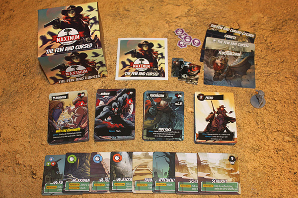 Die Box enthält alles, um einerseits die rothaarige Heldin der Comics, die Fluchjägerin, als Charakter zu spielen und andererseits die triste Welt von „The Few and Cursed“ zum Leben zu erwecken. Konkret heißt das, wir bekommen einen Papp-Aufsteller und eine Plastikminiatur der Heldin sowie den Fluchjägerin-Stapel mit 31 Karten. Dazu gesellen sich zwei Aufsteller für Boss-Gegner (die man eigentlich nicht braucht), sechs Fluchmarker, 30 Gegnerkarten, 30 Stammes-Gegnerkarten, 4 Promo-Karten (was daran „Promo“ ist, weiß ich nicht, denn zwei von ihnen braucht man zwingend für die vorliegenden Szenarien), vier Kartentrenner und schließlich ein kleines Regelheftchen samt drei Missionen.