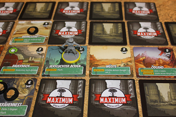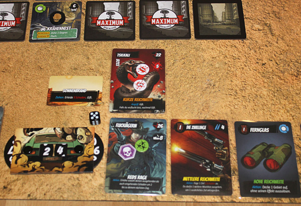Der bedrückenden Comic-Vorlage angemessen, kommt das ganze Set ziemlich düster daher und die drei Missionen sind auch durchaus knackig zu nennen. Das liegt nicht zuletzt an den verwendeten Gebietsplättchen. Es gibt sehr wenig Felder mit Such-Symbol, dafür ganz viel Einöde und Wüste, Felder, die einem allein beim Betreten ein Opfer abfordern. Dazu kommt der Status „verflucht“, den man sich durch ein Gebiet oder Gegner einhandelt und der auf praktisch allen neuen Gebietsplättchen negative Effekte zur Folge hat. Will man also dort Unterschlupf vor den Hitze-Gefahrenkarten suchen oder die Such-Symbole nutzen, die die Plättchen aufweisen, muss man – erneut – immer ein Opfer vorher bringen.