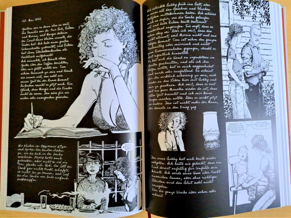 So gigantisch wie die Erzählung im Comic „Monster“ angelegt ist, so gigantisch sind auch die Zeichnungen. Diese sind nämlich allesamt in Schwarz-Weiß gehalten worden. Von klassischen 9er Panels auf einer Seite, hin zu ganzseitigen Zeichnungen, aber auch zu rahmenlosen und sehr künstlerischen Anordnungen der Panels ist in diesem Comic alles enthalten. Immer passen diese zum Tempo der Handlung und beeinflussen so die Gefühle beim Lesen. Sehr stark stechen die Tagebucheinträge von Janet heraus. Das hätte man so sicher nicht erwartet! Beinahe mag man diese Seiten als „Jump-Scare“ ganz eigener Art bezeichnen. Denn plötzlich tauchen sie erst nach gut einem Drittel des Comics ganzseitig auf und lassen uns in das Innenleben von Janet blicken. Umso furchtbarer ist es dann, mitanzusehen wie Bobby durch seinen Vater gebrochen wird, ohne dass die Mutter etwas davon mitbekommt. Oder will sie das alles einfach nicht sehen? Beim Wechsel von Tagebucheinträgen und „realen“ Geschehnissen in klassischer Comic-Form, entfaltet der Titel „Monster“ eine nur schwer auszuhaltende Wirkung. „Schaut nicht (mehr) weg!“, will uns Barry Windsor-Smith immer wieder zurufen!