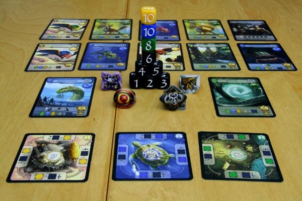 Ist die Würfelphase beendet, kann man sich für die Summe der Würfelwerte ein Monster schnappen, was in einer allgemeinen Auslage liegt. Es gilt: Je höher das Ergebnis, desto besser die Ausbeute, also wird man während des Würfelns immer versuchen, das Meiste herauszuschlagen. Aber tatsächlich ist das gar nicht immer gut, aber dazu muss der Spielablauf noch etwas näher erläutert werden.