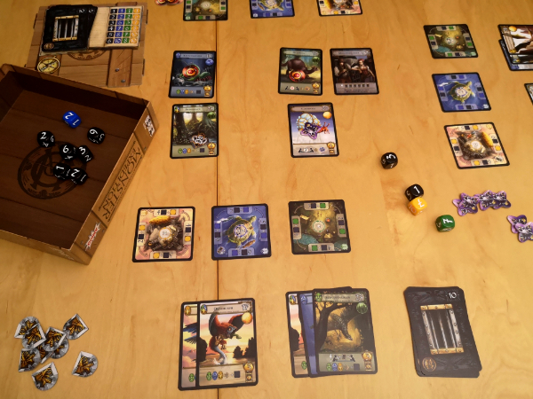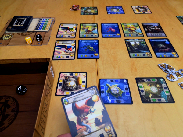 Jede Runde aktiviert man also ein Camp und geht auf die Jagd nach den Monstern dieses Landschaftstyps. Dabei sind hohe Zahlen wichtig, aber sollte man kein Glück haben und nur kleine Zahlen würfeln, ist das nur teilweise schlecht, denn diese werden genutzt, um die Camps aufzuwerten, womit in der nächsten Runde mehr Würfel zur Verfügung stehen könnten. Sind die Monster gefangen, geben sie nicht nur Siegpunkte, sondern auch Spezialeffekte, die es erlauben, noch mehr Würfel einzusetzen, bei der Verbesserung eines Camps zu helfen oder anderen Spielern Karten abzujagen.