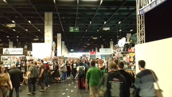 Entschädigt wurde ich aber wie in den letzten Jahren auch, nachdem ich – nach einer erfreulich kurzen Einlassschlange – die Messehallen betreten konnte. Die Vielfalt an Ausstellern und Besuchern, welche die RPC zu vereinen imstande ist, sucht auf dem Markt wohl ihresgleichen. LARPer und Cosplayer in aufwendigen Kostümen, ein Mittelaltermarkt mit Livemusik-Bühne, Aussteller aus allen Sparten des fantastischen Genres: Hier findet sich für jeden Fan das Richtige. Egal ob Tabletop, Rollenspiel, LARP, Computerspiel oder Trading-Cards. Alle Besucher sind vereint in ihrer Liebe zur Fantasie und immer wieder findet man Gleichgesinnte zu einem gemütlichen Plausch. Richtig bewusst wurde ich mir der Vielfalt, als ich nach einer gemeinsamen Zigarette mit Luke Skywalker – ein sehr schönes Kostüm – beim Betreten der Messehallen über den Schwanz eines Tyrannosauriers stolperte. Das bestimmt drei Meter große Kostüm war wirklich beeindruckend.
