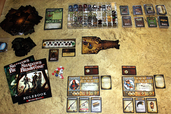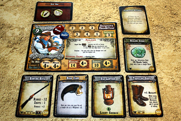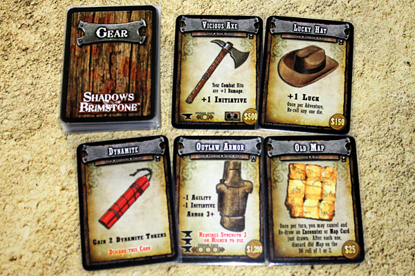 Doch „Brimstone“ ist nicht nur ein fieses Spiel, das einem ständig Ärger in Form von Darkness-Karten, Encounters oder Gegnern in den Weg wirft, es ist auch ein Spiel voller Hintertüren, und der Tod tritt nur selten wirklich ein. Dabei helfen neben Würfelglück – viel Würfelglück! – vor allem zwei Dinge: Ausrüstung und Dollars. Beides erhält man etwa durch Scavenging oder nach Kämpfen, denn dann darf man zur Belohnung Loot-Karten ziehen. Ausrüstung, klar, bringt direkte Boni fürs Spiel. Bessere Waffen, Skill-Boni, Schutz, mehr Health oder Sanity für den eigenen Charakter. Und mit Dollars kann man nach dem Abenteuer (egal ob erfolgreich oder ein Desaster) in die nächstbeste Frontiertown ziehen, um dort einzukaufen.