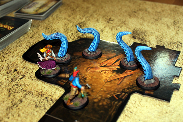 Die Spielbox, die man nach dem Kauf in den Händen hält, ist groß und schwer und sieht echt super aus. Ein grimmiger Sheriff, ein taffes Cowgirl, ein fanatischer Priester und ein schießwütiger Indianer schlagen sich durch einen Dschungel und werden von allen Seiten von Tentakeln und Zähnen und dem Morast entsteigenden Untoten bedrängt. Ich meine, was will man mehr?! In dieses Staunen mischt sich Entsetzen, wenn man die Box dann öffnet. Denn auf der Habenseite befindet sich unglaublich viel Spielmaterial im Inneren: Karten, Spielpläne, Spielmarker, ja sogar ganz unten eine CD mit Stimmungsmusik! Eine CD! Wie viele Spiele bieten das, bitteschön? Dazu kommen Unmengen an Spielfiguren, doch die – Stichwort Entsetzen – sind allesamt noch in ihren Gussrahmen, wie bei einem klassischen Tabletop-Spiel. Ja, richtig gelesen. Vor der ersten Partie „Brimstone“ müssen erst einmal alle Helden und Monster aus den Rahmen gelöst, mit Revell-Kleber geklebt und im Bestfall auch noch stimmungsvoll bemalt werden. Damit ist man die ersten beiden Spielenachmittage schon mal gut beschäftigt.