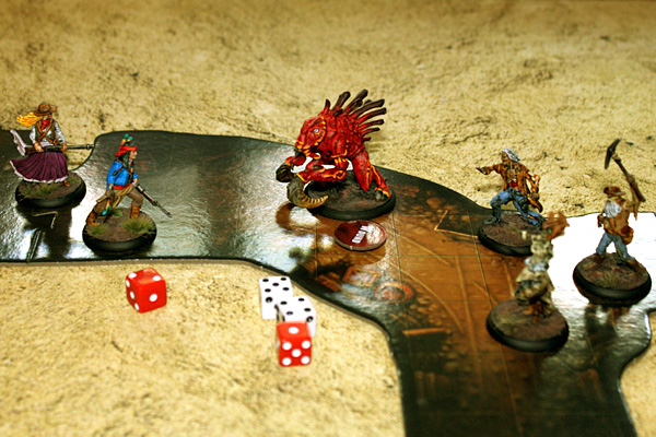 Auch die Feinde würfeln mit W6 gegen ihren Range- oder Melee-Wert, allerdings dürfen Helden versuchen, jedem Treffer mit einem Defense-Wurf auszuweichen (W6 mit Zielwert der eigenen Defense). Jeder Treffer, der durchkommt, verursacht in der Regel festen Schaden (manchmal auch W6), der wiederum durch Armor Rolls abgewehrt werden kann, wenn man denn als Cowboy eine Metallplatte unter dem Poncho trägt. Übrig bleiben dann erneut die Wunden. Die können neben körperlicher übrigens auch geistiger Natur sein, weswegen man nicht nur durch KO, sondern auch durch Wahnsinn aus einer Partie ausscheiden kann. Oh, und mutieren, das kann man auch noch. Wenn man zu viele Corruption Points angesammelt hat. Wirklich famos!