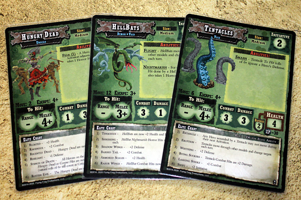 Wer genug XP hat, der kann auch aufsteigen! Das Spiel sieht einen Aufstieg bis Level 8 vor, wobei man jedes Mal einen individuellen Upgrade-Bonus erwürfeln und auf einer Upgrade Chart eine Fähigkeit auswählen darf. Das erste verbessert in der Regel Werte auf dem Charakterbogen, von Skills über die Bewegung bis zu Health und Sanity. Das zweite erlaubt einen kleinen Extra-Kniff. So kann man vielleicht zwei Würfel für die Bewegung werfen und dann den wählen, der einem besser gefällt. Oder man kann einmal pro Zug nach einem Treffer einen Schadenswürfel neu werfen. Oder man vermag sich so geschickt zu bewegen, dass man fürderhin durch andere Modelle hindurchziehen darf. Damit das Spiel danach nicht zu einfach wird, bekommen die Monster natürlich auch Vorteile. Das beginnt mit zufällig ausgewürfelten Elite-Fähigkeiten, geht mit der „Brutal“-Seite des doppelseitig bedruckten Enemy Record Sheets weiter und endet dann mit zwei Elite Abilities auf der „Brutal“-Seite. Spätestens dann wird sogar ein ursprünglich schlapper Untoter zu einer ernst zu nehmenden Gefahr.