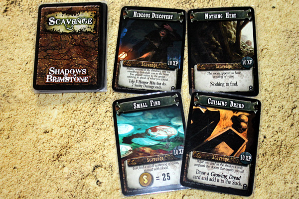 Als Schritt zwei werden alle Helden in Initiativereihenfolge aktiviert. Das geht schnell und simpel vonstatten. Man erwürfelt seine Bewegungsreichweite, dringt ein Feld pro Würfelauge weiter vor und kann dann entweder an der Schwelle zu einem neuen Kartenteil stehend den nächsten Teil der Mine (oder des Dschungels) platzieren (natürlich zufällig gezogen) oder man durchsucht den Bereich, in dem man sich gerade befindet. „Scavenging“ ist ein beliebter Sport, bringt er doch Dollar und XP ein, die man beide zwischen Abenteuern zum Verbessern der eigenen Recken braucht (ja, „Brimstone“ ist als Kampagnenspiel angelegt). Die Sache hat aber einen Haken: Nur ein kleiner Teil der Scavenge Cards ist einem freundlich gesonnen. Es kann auch einfach nichts da sein – oder Ärger lauern!
