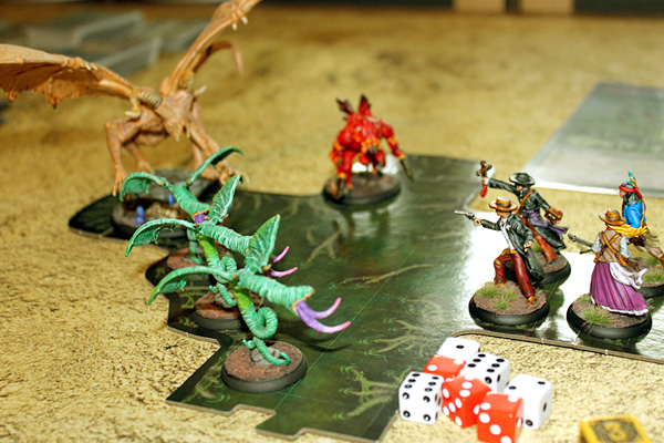 Fazit: „Brimstone“ ist der wahrscheinlich pulpigste, vielseitigste, fieseste und zugleich unterhaltsamste Dungeon Crawler, den ich je auf dem Tisch hatte. Habe ich schon eingangs geschrieben? Stimmt aber immer noch. Die Box „Swamps of Death“ ist ein super Einstieg in das Spiel, der neben Minenabenteuern in dampfende Dschungel entführt. Zwei Haken hat das Ganze: Die erste Partie muss man sich erarbeiten. Es gilt einige Regeln zu verdauen, vom Zusammenbau und Bemalen der Spielfiguren ganz zu schweigen. Und: Man muss bereit sein, sich auf ein hemmungslos glückslastiges Abenteuer einzulassen. Das ist nichts für zwanghafte Strategen oder Jammerlappen, sondern eindeutig für Leute, die einfach ihren Revolver schnappen, eine Liane packen und sich dann johlend ins Chaos stürzen. Wenn du dich zu dieser Art von Spielern zählst, könnte „Shadows of Brimstone – Swamps of Death“ der Anfang einer wunderbaren und lang anhaltenden Freundschaft sein.