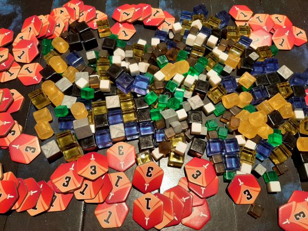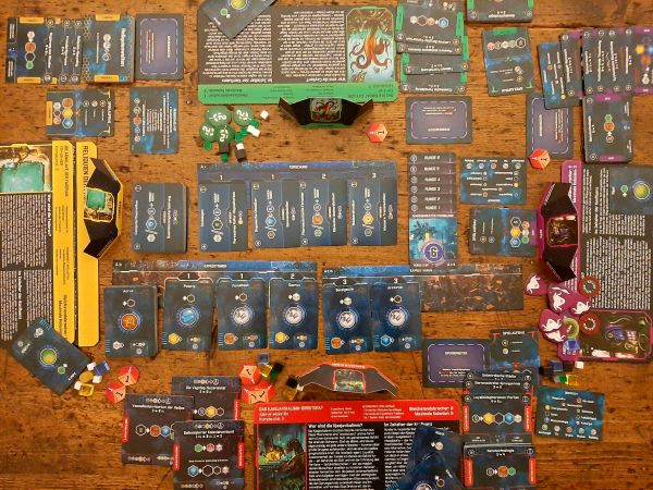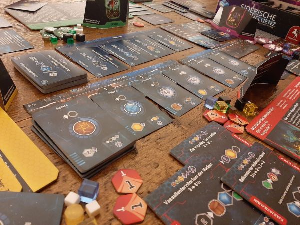 Statt eines Spielplans liegen nur die Plättchen, Ressourcen und Spielertableaus auf dem Tisch. Das macht zunächst nicht besonders viel her, wird aber durch die vielen Karten, deren Anzahl sich im Laufe des Spiels so sehr steigert, dass diese gegen Ende einer Runde von „Siderische Konfluenz“ den gesamten Tisch bedecken, stetig kompensiert. Und alles, was man sehen kann, ist für einen erhältlich – sofern natürlich der Preis stimmt.