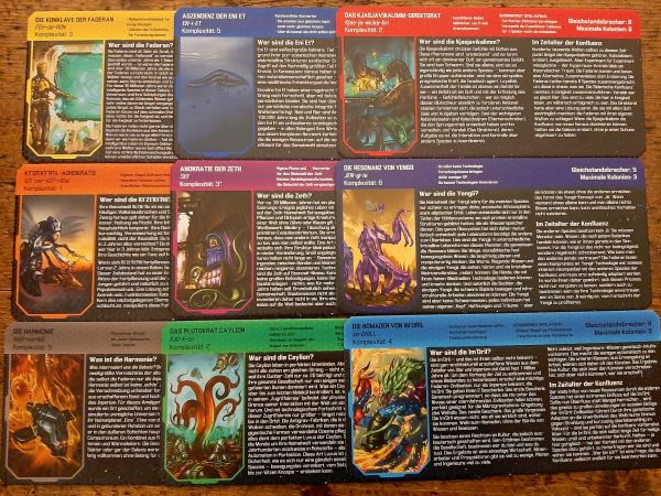 Die neun verfügbaren Spezies spielen sich dank ihrer asymmetrischen Fähigkeiten anders. Für jedes der neun Völker gibt es einen eigenen Sichtschirm, ein Tableau und ein Deck an Karten. Auf dem Tableau steht nicht nur die korrekte Aussprache der Völker, sondern auch etwas über deren Geschichte. Die korrekte Aussprache ist wichtig, da die Namen, wie beispielsweise Kjasjavikalimm oder Kt’Zr’Kt’Rtl leicht falsch geäußert werden können. Das wäre aber für einen langfristigen Handel kein guter Start in eine Verhandlung, wenn man bereits den Namen nicht auszusprechen weiß … Zudem findet man auch einen Hinweis zur Schwierigkeit des Volkes, an der man sich als Neuling orientieren sollte. Auch der generellen Ablauf einer Runde und die individuellen Spezialfähigkeiten der Außerirdischen sind auf der Rückseite abgedruckt. Hierdurch möchte man mindestens so viele Spielepartien bestreiten, dass alle Teilnehmerinnen und Teilnehmer an der Konfluenz auch jedes Volk einmal spielen durften. Eine Partie allein ist auf 120-150 Minuten angesetzt, sodass man viele Spielstunden gemeinsam verbringen kann.