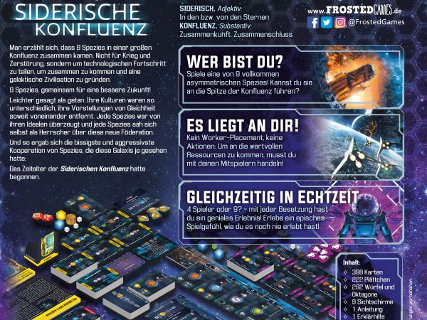 „Siderische Konfluenz“ ist ein Expertenspiel von TauCeti Deichmann. Es umfasst 398 Karten, 222 Plättchen, 292 Würfel und Oktagone, 9 Sichtschirme, 1 Anleitung und 1 Erklärhilfe. Dieses gewichtige Brettspiel erschien bereits 2017 in englischer Sprache unter dem Titel „Sidereal Confluence“. Schließlich stellte sich das Team von Frosted Games der Aufgabe, die vielen Begriffe im Spiel akkurat zu übersetzen und neue, klar voneinander unterscheidbare Formulierungen zu finden. Diesem Anspruch gerecht zu werden, brauchte also seine Zeit, bis es 2020 dann hieß: Veröffentlichung. Schnell war es ausverkauft, sodass es für 2021 in einen Nachdruck ging.
