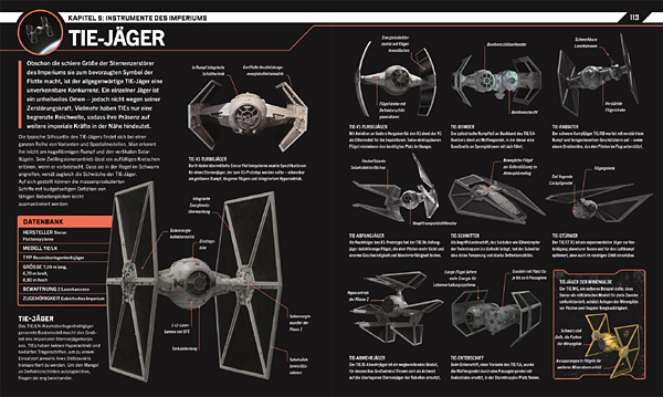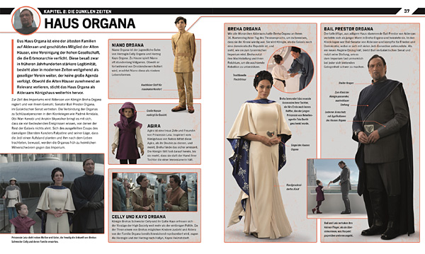 Die einzelnen Kapitel Stück für Stück durchzugehen, würde hier den Rahmen sprengen und ist auch nicht nötig. Wer je eine illustrierte Enzyklopädie von DK in der Hand hatte, weiß, wie diese Bücher aufgebaut sind. Das Konzept ist sich immer extrem ähnlich. Allen Neulingen sei gesagt, dass sich dieses Buch vor allem durch eine Handvoll Designprinzipien auszeichnet. So haben Einträge hier meist eine Doppelseite. Diese kann sich zum Beispiel mit einer Gruppierung („Imperiales Militär“, „Delegation der 2000“), einem Schauplatz („Alderaan“, „Lothal“), einer Person „Leia Organa“, „Obi-Wan Kenobi“), Vehikeln („Millennium Falke“, „Imperiale Zerstörer“) oder einem Ereignis („Der Aufstieg der Sturmtruppen“, „Raub auf Aldhani“) beschäftigen.