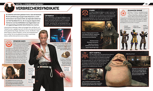 Ein Blick ins Inhaltsverzeichnis zeigt, dass die sieben Kapitel zwar thematische Überschriften haben, aber die Inhalte gleichzeitig grob chronologisch sortiert wurden. Es beginnt mit der „Gründung des Imperiums“, danach werden „Die dunklen Zeiten“ beschrieben, bevor „Aufständische Welten“ in den Fokus gerückt werden. Am Ende stehen die „Vorwehen des Krieges“. Dazwischen beleuchtet das Buch mit den Kapiteln „Kriminelle Unterwelt“, „Instrumente des Imperiums“ und „Rüstzeug der Rebellion“ die drei Fraktionen, die prägend für das „Star Wars“-Universum jener Jahre sind. Ein alphabetisches Register hilft am Ende des Buchs beim schnellen Zugriff auf einzelne Personen, Planeten oder Raumschiffe.