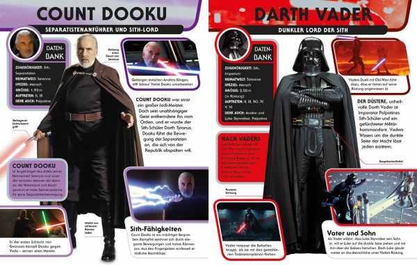 In Sachen Layout hat sich wenig getan. Unverändert erhält jede Figur genau eine Seite in dem Buch. Dort wird sie in einem großen Ganzkörperporträt abgebildet, ein bis drei zusätzliche kleinere Bilder bieten etwas visuellen Kontext zu der Figur. Dazu kommt ein Datenbankeintrag, der Zugehörigkeit, Heimatwelt, Spezies, Größe, Filmauftritt und verknüpfte Einträge listet. Kurze Textkästen bieten nette, wenn auch kaum erschöpfende Informationen. Im Ganzen handelt es sich eher um knappe, aber durchaus prägnante Einführungen in das Leben und Wirken der aufgeführten Helden, Schurken und Droiden. Der Zweck dieses Nachschlagewerks ist dadurch voll erfüllt.