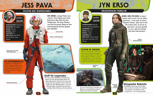 Im Gegenzug sind eine Menge Protagonisten der neusten drei Filme hinzugekommen. So geben die Crew um Jyn Erso, die Gauner, mit denen der junge Han Solo unterwegs ist, und zahlreiche Widerständler rund um Rey, Finn und Poe Dameron ihren Einstand. Auch diverse neue Trupplertypen, wie Schlammtruppler oder Todestruppler, finden sich in dem Buch. Erneut gibt es dabei eine Menge Detailinformationen für den Fan zu entdecken, beispielsweise, dass Bohdi Rook in seiner Freizeit auf Odupiendorennen wettet, General Draven von Pendarr III stammt und Protokolldroidin ME-8D9 so oft neu programmiert wurde, dass ihre Vergangenheit selbst für sie ein Mysterium ist, das immer mal wieder unerwartet Teile von sich preisgibt.
