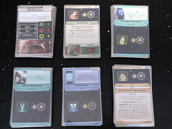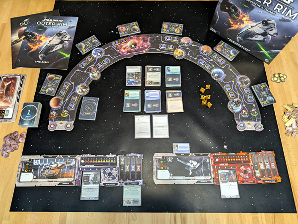 Fazit: Wer „Star Wars“ mag – und hier vor allem die schurkische Seite der Macht –, der wird an „Outer Rim“ seine helle Freude haben. Das Spiel vermittelt toll die Stimmung durch das All düsender Glücksritter, die am Rande des Rechts um Credits und Prestige ringen und dabei durchaus auch mal die Moral über Bord werfen, um dem Sieg ein Stück näherzukommen. Dabei gibt es verschiedene Möglichkeiten, zum Sieg zu gelangen. Man kann sowohl als Schmuggler als auch als Kopfgeldjäger oder als Schrecken aller Raumpatrouillen Ruhm erringen. Das Spiel mag vielleicht kein Dauerbrenner sein – der narrative Teil fühlt sich halt nach ein paar Partien etwas repetitiv an –, aber wenn es gelegentlich auf den Tisch kommt, ist ein unterhaltsamer Abend garantiert. (Und wer gern „mehr von allem“ möchte, der sucht nach der Erweiterung „Offene Rechnungen“, die noch einmal für frischen Wind im Außenrand sorgt.)