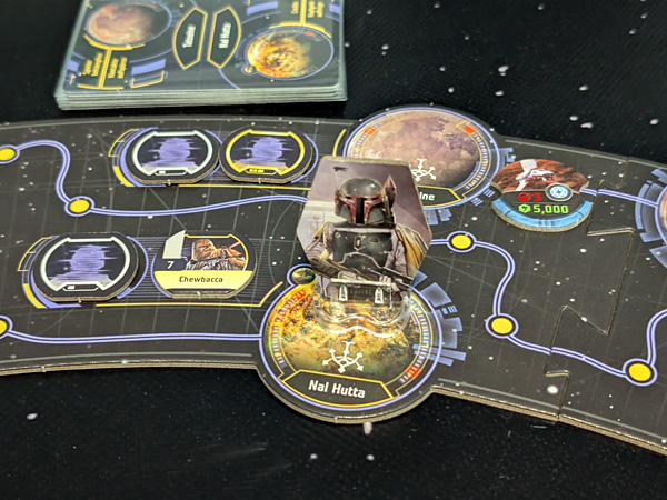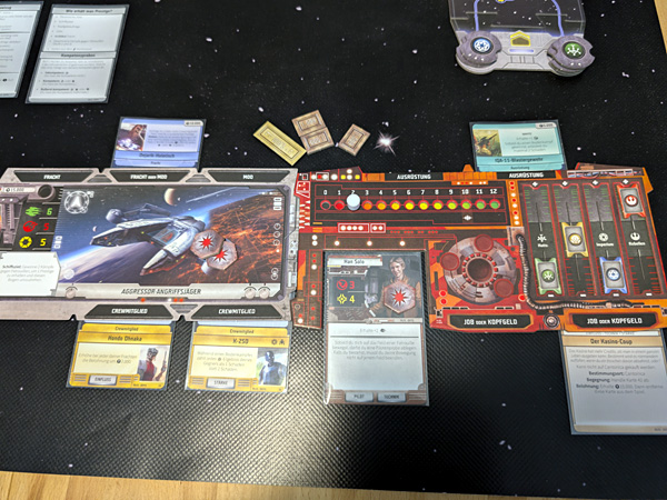 Neben dem Spiel zu zweit bis viert gibt es auch einen Einzelspieler-Modus. Das Spiel verläuft dabei im Wesentlichen wie bei einer Mehrspielerpartie, allerdings trete ich hier gegen eine KI an, also einen Charakter, der im Wesentlichen durch die Karten in einem KI-Deck gesteuert wird. Hierbei gelten für die KI-Figur ein paar Vereinfachungen, was die Regeln angeht. Für mich ist dieser Einzelspieler-Modus allerdings nur ein Behelfskonstrukt. Ja, er funktioniert, aber richtig Laune macht „Star Wars: Outer Rim“ natürlich vor allem mit ein paar gleichgesinnten „Star Wars“-Nerds, die die filmreifen Situationen, in die man immer wieder gerät, auch richtig zu schätzen wissen (etwa wenn Lando ein High-Stakes-Sabacc-Turnier gegen Jyn Erso verliert oder Bossk mit einem Raketenwerfer Greedo auf Tatooine „besucht“).