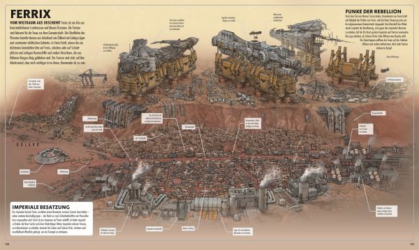 Der nächste große Abschnitt, „Ära des Imperiums“ beginnt gleich mit neuen Doppelseiten. Im Vorgängerband ging es mit dem Besuch auf Tatooine und der Lars-Farm los. Hier finden die Leser zunächst Einträge zu Corellia (genauer: dem Industrieviertel von Coronet), dem Conveyex-Raub auf Vandor, den Minen von Kessel, Ferrix, dem Gefängnis auf Narkina 5, dem imperialen Senat, Jedha, Vaders Festung und Scarif. Das erfreut das Fan-Herz natürlich, aber ich muss auch Kritik üben. Es ist das Nötigste, was uns hier an Schauplätzen zu den Filmen „Solo“ und „Rogue One“ sowie der Serie „Andor“ geboten wird. Wo ist die Sabacc-Höhle, in der Han auf Lando trifft, wo das Heim von Cassian Andor oder Bix’ Werkstatt auf Ferrix? Auch Jedha hätte einen viel näheren Blick in seine lebhaften Straßen verdient. Ebenso fehlt das Versteck von Saw Gerrera und seinen Partisanen. Die Minen von Kessel sind eine ebenso flott hingeschluderte Doppelseite wie Jedha oder die Schlacht von Scarif. Richtig gelungen sind hier nur die Stadtansicht von Ferrix-Stadt und das Gefängnis auf Narkina 5.