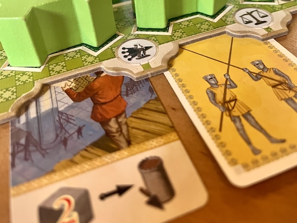 Spielt ihr die Karte aber verdeckt aus, löst ihr eine der fünf Hauptaktionen aus. So könnt ihr den Markt besuchen und dort Rohstoffe kaufen oder verkaufen, euch bessere Handkarten organisieren, eure Fachkräfte befördern, um Boni zu aktivieren, Verbündete anwerben, um stetig Siegpunkte anzuhäufen oder eure Burg-Baustelle Stück für Stück voran zu treiben.