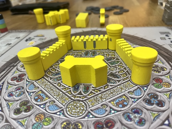 Parallel baue ich noch an meinem privaten Burgprojekt. Je weiter ich es vorantreibe, desto mehr Boni wirft es am Ende einer Runde für mich ab. Und dann sollte ich mich auch noch an dem Bau des Kaisersitzes, dem Castel del Monte, beteiligen und nicht vergessen, meine Fachkräfte zu fördern. Ich sag euch, für euch als Friedrichs Gefolgsleute gibt es in diesem Eurogame reichlich zu tun.