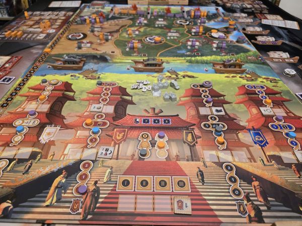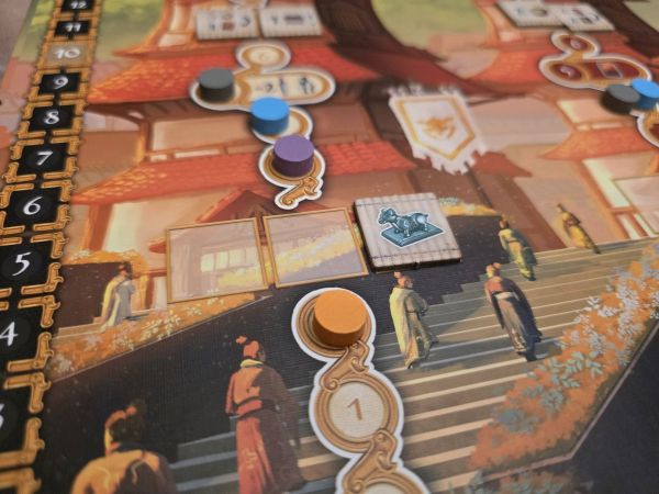 Am Ende jeder Runde steht das Buchhalten an. Aber das ist schnell erledigt. Am Ende der Runde 4 ist meist nicht mehr viel Tag übrig. Dann steht die Schlusswertung an. Für das Voranschreiten auf den Palastleisten gibt es Punkte, für die Auftragskarten und das gesammelte Jadefiguren-Set. Ja, auch die sammelt ihr während des Spiels durch Voranschreiten auf den Palastleisten oder das Einsetzen des ersten Gouverneurs in ein Provinzgebäude.