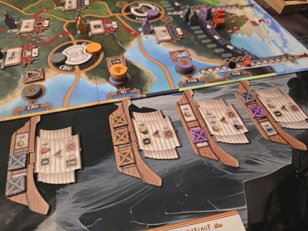 Was ist die „besondere Komponente“ bei „Tianxia“? „T’zolkin“ hatte die ineinandergreifenden Zahnräder, „Teotihuacan“ die Pyramide mit diesen Wohlfühlsteinen, „Tekhenu“ den übergroßen Obelisken, der angemalt zu einem wahren Schmuckstück wurde. Und „Tianxia“? So richtig fällt einem da nichts ins Auge. Gut, die Barken, die in den Spielplan eingesteckt werden und diesem so etwas Dreidimensionalität mit Runterstupsfunktion verleihen. Aber das ist es eigentlich nicht. Die zweiteiligen Segelschiffpuzzles machen sich auch gut. Aber so richtig spektakulär wirken diese auch nicht. Trotzdem: „Tianxia“ hat eine sehr gute Tischpräsenz, aber eben keine herausragende. Gut gelungen ist die Gliederung des Spielbretts. Und das ist auch ein Wert. Aber es begeistert nicht.