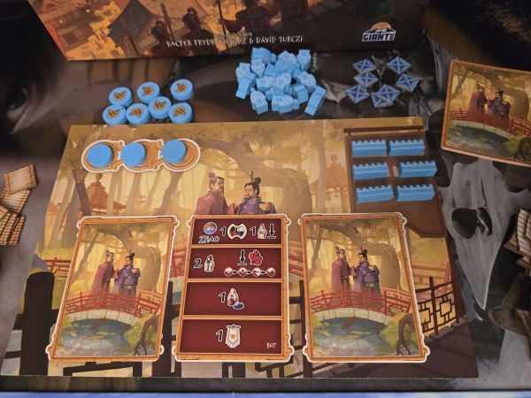 „Tianxia“ hat eine Menge Spielmaterial. Ein nahezu gewaltiges Spielbrett entfaltet sich in bunten Farben, aber gut strukturiert, auf dem Spieletisch. Segel schmücken kleine Schiffchen, die seitlich am Spielplan vor Anker gehen. Barken werden auf den Spielplan gesteckt, unsere Arbeiter einladend, um sie später rücklings über Bord zu schicken – nicht als Todgeweihte, sondern als Händler. Natürlich. Ein Haufen stilvoller Gebäudeplättchen sorgt für Variabilität auf dem Spielplan. Jedem Spieler wird ein eigenes Spielbrett zuteil, das irgendwo auf dem hoffentlich geräumigen Spieletisch seinen Platz finden kann. Dort finden stilvoll bedruckte Mauerteile und Türme aus Holz ihr Zuhause, die Spielfiguren müssen hingegen – trotz ihrer vielen Talente – fußkalt daneben drapiert werden. Zu zweit oder im Solomodus kommt noch ein Extraspielbrett auf den Tisch, um die Verwaltung eines simulierten Gegners zu erleichtern. Hey, dafür sparen wir zu zweit ja an den Spielerboards! Plättchen und weitere Plättchen werden auf dem Spielbrett platziert, Karten gemischt und verteilt, und, und, und.
