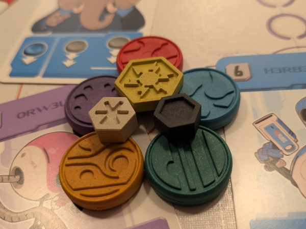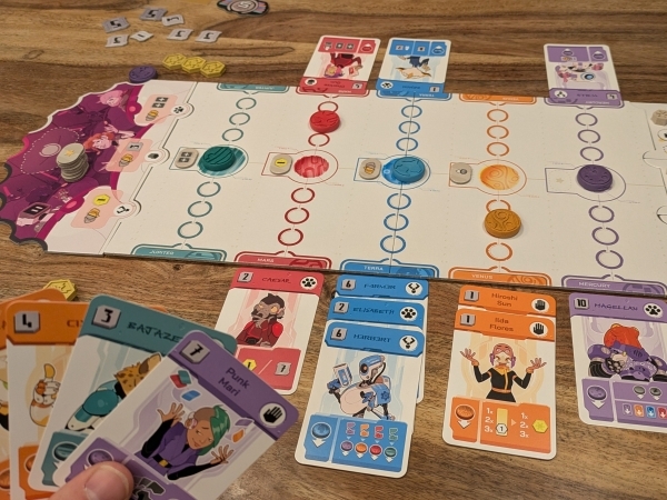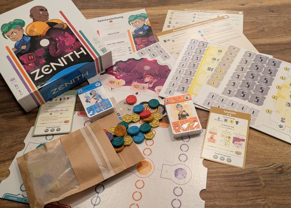 Zweifelsfrei hat der Verlag hier tolle Arbeit geleistet. Die Planeten, das Zenithium (eine Währung im Spiel) und die Technologiesteine sind aus einer Art Kompostmaterial und erinnern an gute Ergebnisse aus einem 3D-Resindrucker. Das kombiniert eine schöne Haptik und tolle Farben mit feinen Details. Schon beim Öffnen der Packung war ich sofort begeistert. Die Karten haben fantasievolle Illustrationen von Persönlichkeiten der drei verschiedenen Völker im Spiel und lustige Namen mit vielen Andeutungen und versteckten Referenzen. Die Box hat genau die richtige Größe, die Boards sind ebenfalls gefällig designt und der Spielaufbau dauert nicht länger als ein paar Minuten. Wenn das Material die B-Note bestimmt, gibt es hier jedenfalls keinerlei Abzüge.