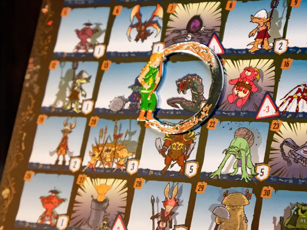 Die abgeschlossenen Herausforderungen markiert man direkt auf dem Kalender, was jedoch manchmal nicht optimal erkennbar ist, da man eine vollflächig farbig bedruckte Fläche übermalen muss. Ein separates Kontrollkästchen wäre praktisch gewesen. Den aktuellen Tag markiert man mit einem Magnet und einer metallenen Figur, die liebevoll gestaltet ist. Durch ihre unglückliche Form überdeckt sie jedoch spielrelevante Inhalte.