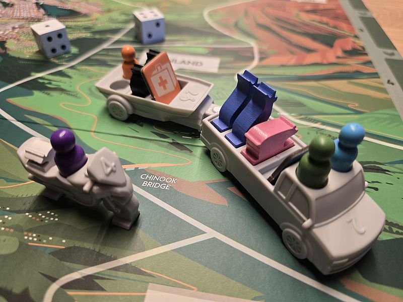 Wie können wir nun die Niederlage und die Tränchen abwenden? „Do 3 actions“, verrät das Regelheft. Und von denen gibt es nur zwei unterschiedliche. Wir können uns bewegen – natürlich nicht zu Fuß, sondern in einem der Fahrzeuge. Hey, wir sind in Amerika! Dabei können wir Ausrüstung, Kollegen und auch Tiere mitnehmen. Alles in Absprache. Unterschiedliche Fahrzeuge haben da unterschiedliche Eigenschaften hinsichtlich des Stauraums, der Geschwindigkeit und des Antriebs. Neben Autos gibt es auch ein Boot, ein Motorrad und einen Anhänger. Das Motorrad können wir übrigens im Anhänger mitführen, wenn notwendig, und auch das Boot kann angehängt werden – allerdings nicht am PKW, sondern nur an SUV und Truck. Nur eines darf man nie: Tiere allein im Fahrzeug zurücklassen.