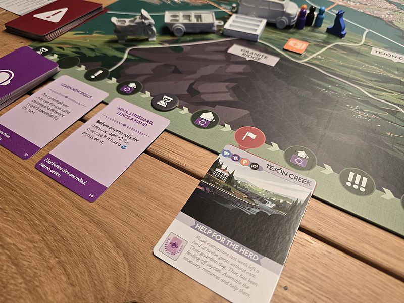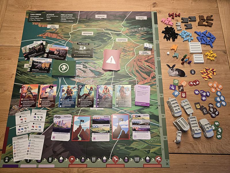Gemeinsam sind wir als Team auf dem Spielplan unterwegs, um die Kartenauslage auf der rechten Seite des Plans im Griff zu behalten: die Tiernotfälle in der Region rund um Davin City. Nach jedem Spielerzug wird hier eine neue Notfallkarte aufgedeckt. Bereits vorhandene Karten werden nach unten durchgeschoben. Verlässt eine dieser Karten unerledigt, das heißt nicht umgedreht, den Spielplan, endet das Spiel mit einer Niederlage. Eine zweite Uhr tickt an der unteren Kante des Spielplans gegen uns. Die Sanduhr auf dem „Time Track” rückt potenziell durch Rettungsaktionen weiter voran. Das entscheiden die Würfel. Ein gewürfeltes Sanduhr-Symbol auf einem der beiden Würfel lässt den Marker vorrücken. Wenn wir am „Time Track“ ausliegende Missionen nicht rechtzeitig erledigt haben, ist das Spiel ebenso zu Ende. Niederlage. Tränchen.