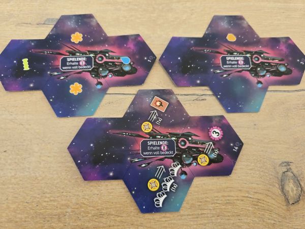 Am auffälligsten sind die neuen Rahmen, die deutlich mehr Abwechslung und taktische Tiefe beim Rahmenbau erzeugen. Die Boni sind jetzt von Rahmen zu Rahmen unterschiedlich. Wir erinnern uns: Die Rahmen im Grundspiel brachten beim Überbauen der entsprechenden Hex-Felder immer nur eine Saatkarte als Bonus. Gähn! Auf den neuen Rahmen findet man Ressourcen, Erkundungsmarker, Siegpunkte, Umwandlungsaktion, Saatkarten, usw. Jetzt spielt eine Rolle, wie man genau den Bienenstock aufbaut und wann man sich welche Boni zunutze zu machen versteht. Dafür stehen die Rahmen nun als gleich zwei offen liegende Stapel zur Verfügung.
