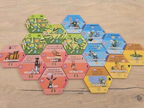 Die Saatkarten sorgen insgesamt für mehr Abwechslung, krempeln das Spiel aber nicht von links nach rechts. Auch die neuen Waben sorgen für frischen Wind. Die optionale Saatkartenvariante, in der pro Zug nur noch maximal zwei Saatkarten für ihren Einmalnutzen ausgespielt werden dürfen, verhindert extrem lange Kettenzüge. Leider findet sie sich im Anhang versteckt auf Seite 14 wieder. Das hätte ich mir prominenter weiter vorn im Regelheft gewünscht.