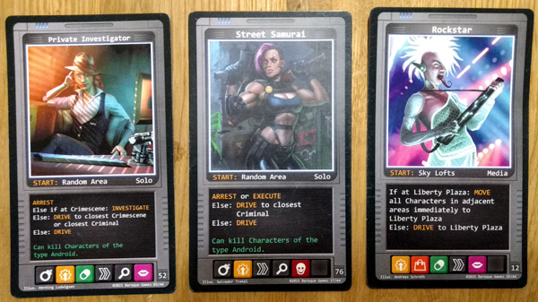 Neben spannenden Spielrunden kann man sich am schön illustrierten Spielmaterial erfreuen. Jeder Charakter hat eine detailreiche Illustration, was ihm seine Einzigartigkeit verleiht. Die Handkarten und das Spielbrett liegen ebenfalls in einem ansprechenden Design vor. Die Illustrationen werden weiterhin optimiert, denn „Axon Protocol“ befindet sich noch in der Entwicklung. Auch wenn diese weit fortgeschritten ist, kann es sowohl optisch als auch spieltechnisch noch zu Abweichungen kommen.